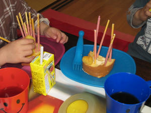 姫ちゃんとぽーちゃんはケーキにいちごポッキーをぷすぷすさして、スナック菓子をのっけて、と、お誕生日パーティー状態でたのしそうな2人。