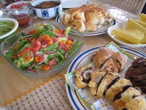 ↑タコス、サラダ、わたしたちの持ち寄りには欠かせないケンタッキー、パンいろいろ