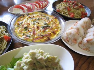 バジル&トマトのパスタ、キッシュ、トマト&モッツァレラ、アボカド&ポテトのサラダ、鮭おにぎり