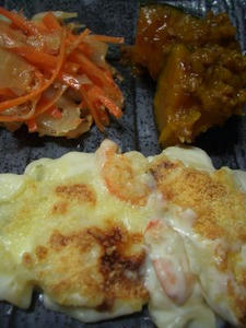 夕飯は、エビグラタン、にんじんとツナのサラダ、かぼちゃのそぼろ煮。