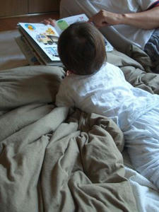 早朝にもかかわらず、ぽーちゃんは目覚めたらすぐに絵本をもってきて、旦那に『はいっ』て手渡すらしい。