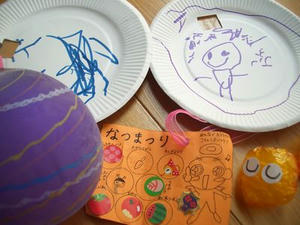 風船つりとか、金魚つり、紙皿に絵をかいてのうちわづくり、ボール入れとかいろんな遊びのコーナーがあって、参加するとカードにシールを貼ってもらえる。