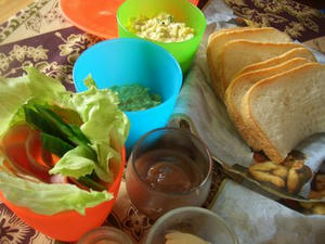 アボカドのディップ、たまごサラダのディップ、サンド用でレタス・ハム・きゅうり、マロンペースト、を。