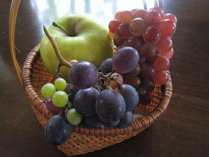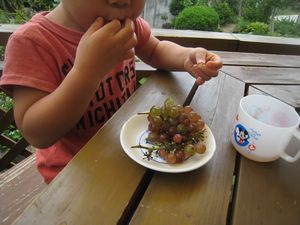 ↑実家での収穫果実たち。(りんご、デラウェア、巨峰)